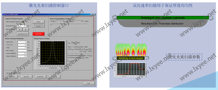 提供激光光束掃描功能,在靶材上保持固定的光通量(J/cm2 )。光束掃描可以使薄膜在襯底上均勻地沉積,厚度均勻性為 5% 或更好。當(dāng)激光光束進(jìn)行掃描時,反射鏡和透鏡同步運動,以確保激光光束在靶材上有固定的光通量。激光掃描使用反比 速率協(xié)議,以確保在沉積薄膜時,靶材表面消融均勻。