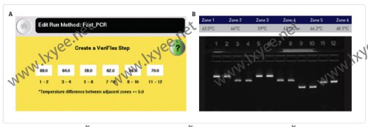 Figure 2. (A) Screenshot from Veriti™ Thermal Cycler showing the annealing temperature being set for 6 different primers. (B) Six different annealing temperatures were set for each of the zones, with the annealing/extension step matching the length of the longest amplicon.