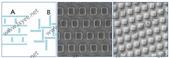 Fig. 13 Different irradiation designs and resulting square structu-res (centre: A; right: B)