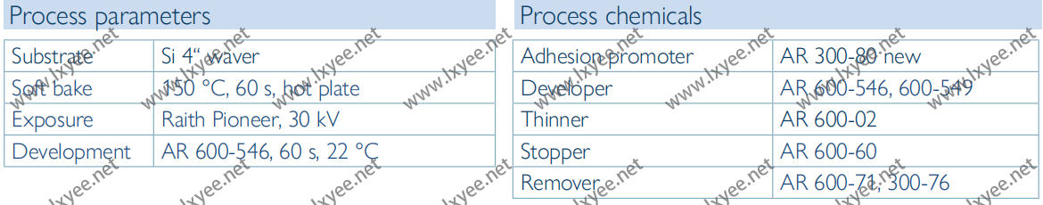 nimum structure size, the developer, the acceleration voltage (1 - 100 kV), and the film thickness.