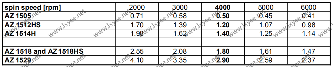AZ 1500 (no suffix) is the most popular family and a direct safer solvent (PGMEA) substitute for AZ 1370, AZ 1470 , AZ 1350J, AZ 1450J, AZ 1375. It is available in different viscosities to cover the coating thickness range from 0.5 to 4.0 µm. Due to the slightly lower evaporation rate of the PGMEA(compared to cellosolve acetate based solvent system) these resists will show about 5 - 10% higher photospeed which may be compensated by increasing prebake temperature about 5°C. This resists may be used for wet- and dry-etch and cover all demands for general semiconductor manufacturing and other applications with resolution down to 1 µm.