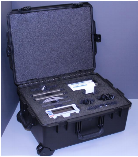 當在實驗室中使用時,TESA 2000可以插入使用AC的標準120VAC插座適配器(電源將接受輸入100-240VAC, 50-60Hz),頭部可以放置測量端口向上,便于放置樣品。當在現(xiàn)場使用時,TESA 2000可以與可選電池系統(tǒng)和攜帶背包(如圖2-2所示)。通過放置電池和控制/顯示單元在包中,用戶可以自由地進行現(xiàn)場測量,相對容易。