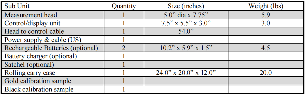 圖2- 2。TESA 2000便攜式反射儀系統(tǒng)::測量頭;控制/展示盒;書包;參考樣品;頭到顯示單元電纜;電池充電器;AC適配器;和2可充電電池。